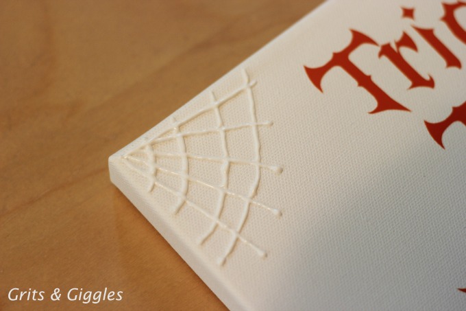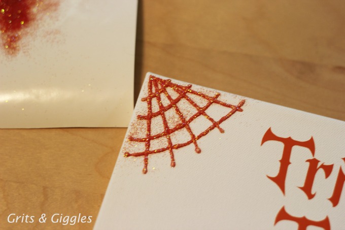 Step 7: To add some fun, use your white glue and draw some spider webs in the corners of your canvas.