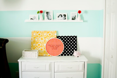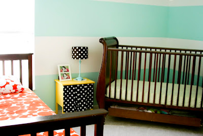 A: Well, i knew that once my youngest was born, i would want him and his big sister to share a room…so i started scouring the internet for inspiration. my first stop was figuring out what the wall color would be. i found a picture of a living room with big stripes on the wall (similar to what their room looks like), and that became my inspiration for the rest of the room. because it’s a shared room, and a boy and a girl are in this room, i had to make it gender neutral as well. so, i threw in oranges and yellows to compliment the blue/teal on the walls.