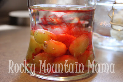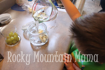 Step 2: The potatoes and grapes obviously sank to the bottom, so I didn’t quite get why I would need a suction cup. Then I tried the cauliflower and it floated. Ding! I didn’t have any suction cups with the little metal clips attached, so I improvised and since this is supposed to be a budget project I had to be creative. I found a couple small suction cups and attached a paper clip to them. Then, I stabbed the bottom of the cauliflower with the paperclip and stuck it to the bottom of the jar.