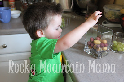 Step 1: Like I said earlier, I wanted to do this project on a budget. So I went to one of my favorite craft stores and bought a few vases and jars. Keep an eye out for 50% off glassware sales. I scored 4 vases for $9.50! I also decided to use whatever I had in my fridge. There is really no need to go buy fresh veggies for this project. I found cauliflower, cabbage, grapes and mini potatoes in my fridge. I Christopher started putting the food in separate jars. Potatoes in one, grapes in another, etc.