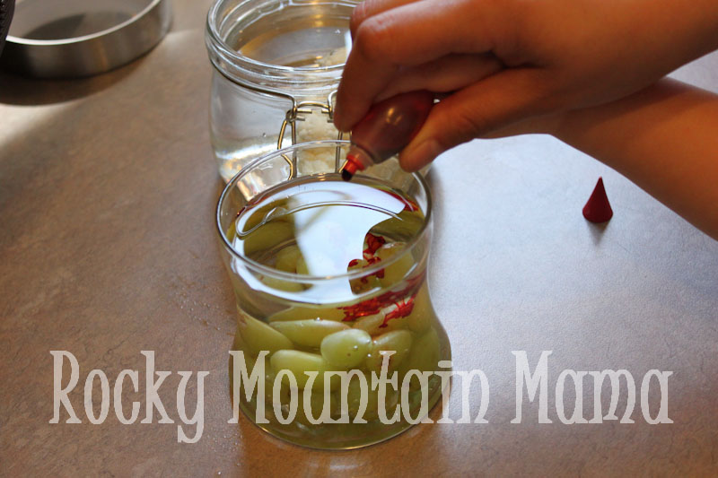 Step 2: The potatoes and grapes obviously sank to the bottom, so I didn’t quite get why I would need a suction cup. Then I tried the cauliflower and it floated. Ding! I didn’t have any suction cups with the little metal clips attached, so I improvised and since this is supposed to be a budget project I had to be creative. I found a couple small suction cups and attached a paper clip to them. Then, I stabbed the bottom of the cauliflower with the paperclip and stuck it to the bottom of the jar.