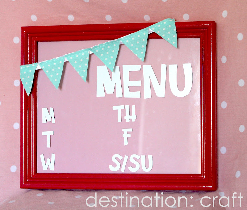 I’m excited to welcome Kathryn of Destination: Craft to my blog. I found her adorable blog after she linked up her DIY Mason Jar Soap Dispenser tutorial to Do Something Craft Friday. You should know by now how much I love me a good mason jar project, so I was immediately smitten with Kathryn’s blog! She’s here today to show us how to make a menu board for, get this, $2!