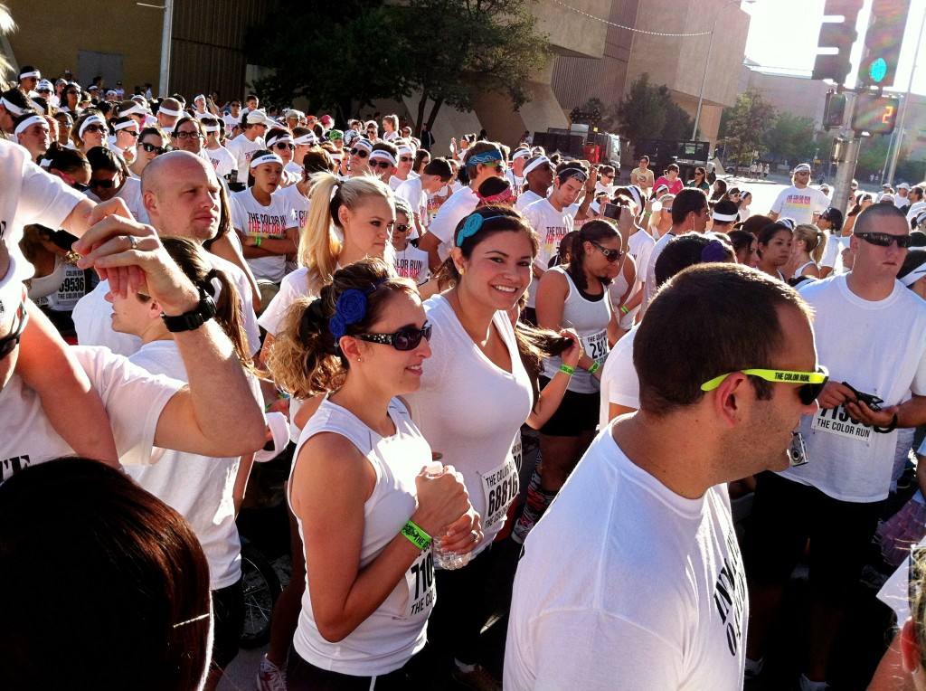 I somehow managed to find my “Roy G. Biv” teammates in a sea of white shirts. Because of my need to turn everything into an excuse to use my hot glue gun, I made my teammates all different colored headbands. We lined up with rest of the crazy 5,000+ people who paid to be dowsed in colored corn starch. They let us go in waves and when it was finally our turn to cross the start line, I was pumped and determined to run the entire way. We went through the first couple color zones together as a team and somehow managed to lose each other in the chaos.