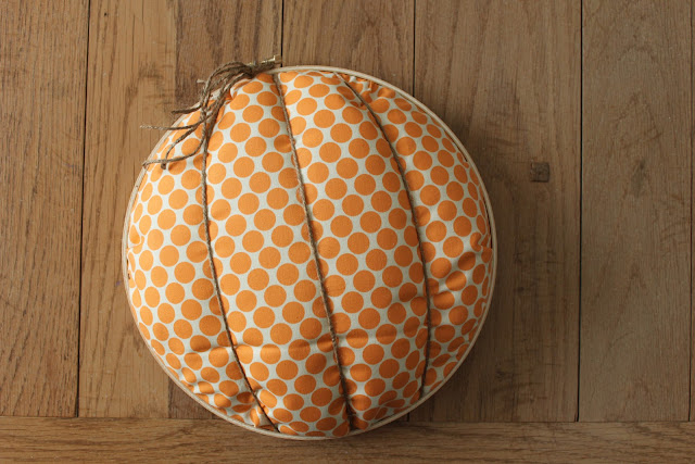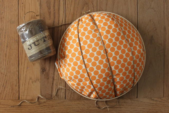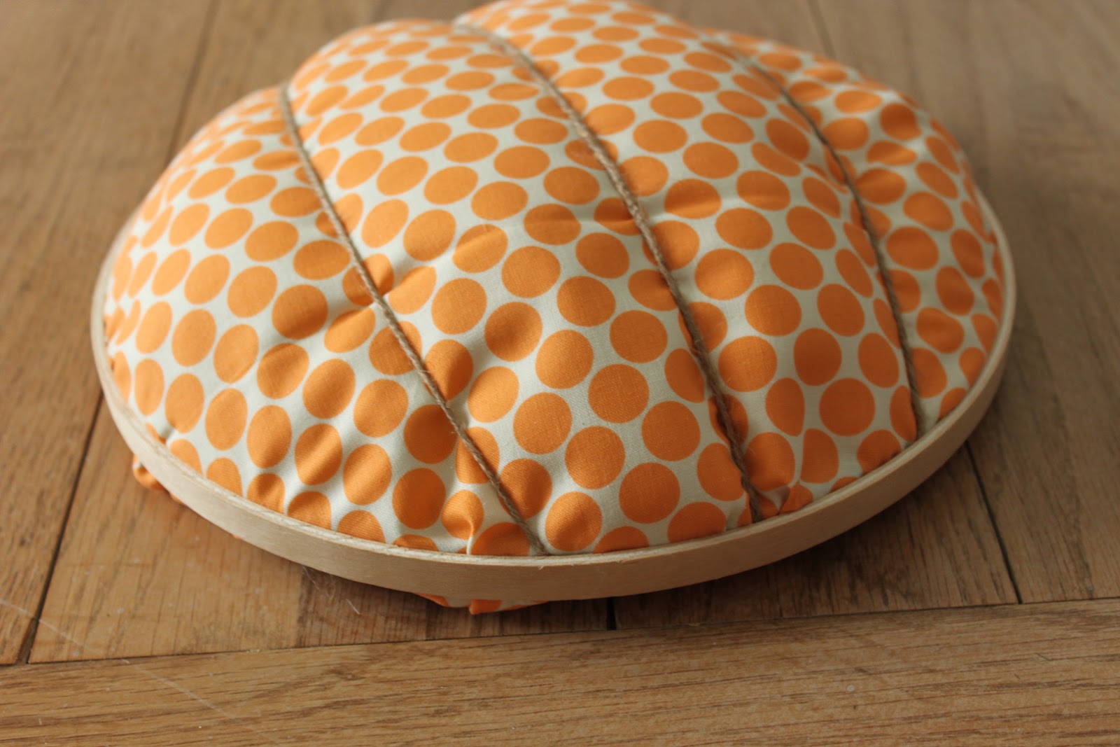 Step 5: Cut 3 peices of twine, embroidery floss or thread and thread them through the top and bottom of the hoop. Arrange the twine so it creates pumpkin segments. Tighten the screw as much as you can and gently pull the twine from the back so it makes an indention and the stuffing puffs up in between.