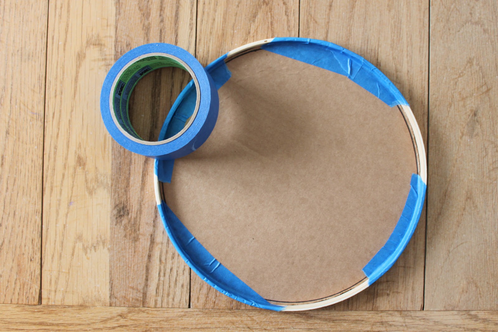 Step 2: Use masking tape of some kind to secure the cardboard into the hoop. You could glue this in if you wanted, but the tape holds it together well.