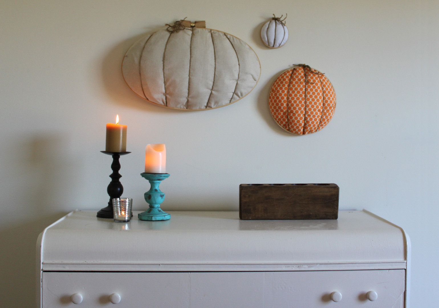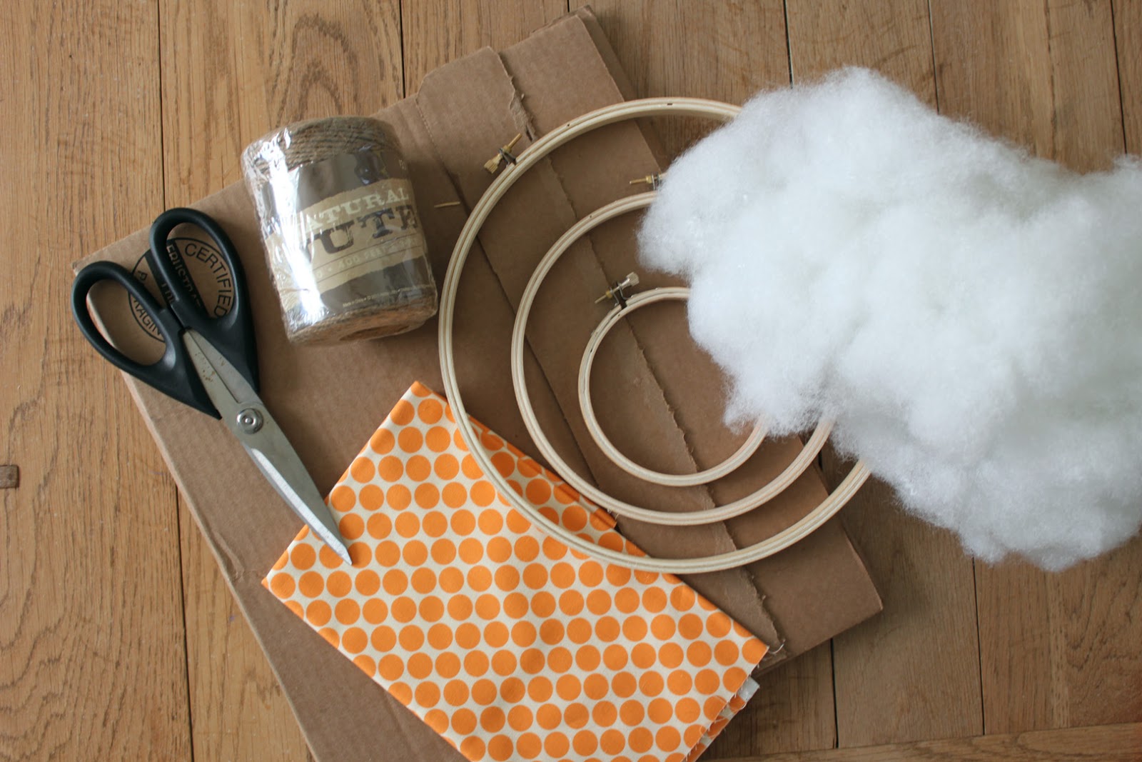 I’ve been slowly adding to my fall and Halloween decorations for the past few years and I’m running out of horizontal surfaces to decorate! I wanted to make something new this year, so the only solution was to go up and create hanging decorations. I always have embroidery hoops and fabric on hand, but wanted something more than the usual flat hoop art, something to add a little interest. I scanned my craft room and landed on the giant bag of stuffing in the corner. I came up with a way to make fun 3-D pumpkins that will decorate my home for the entire season.