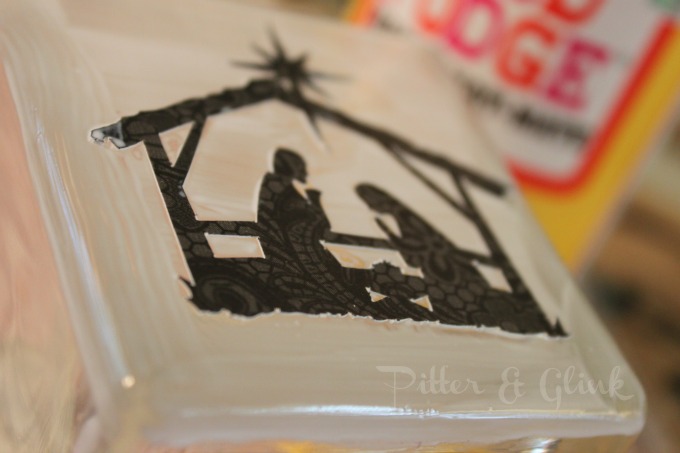 Step Three: Adhere your nativity silhouette to the front of the candle holder with Mod Podge. I used my Silhouette to cut an image from black paper, but vinyl would work really well. Or if you don’t have a Silhouette, you could print a nativity silhouette and cut out the image.
