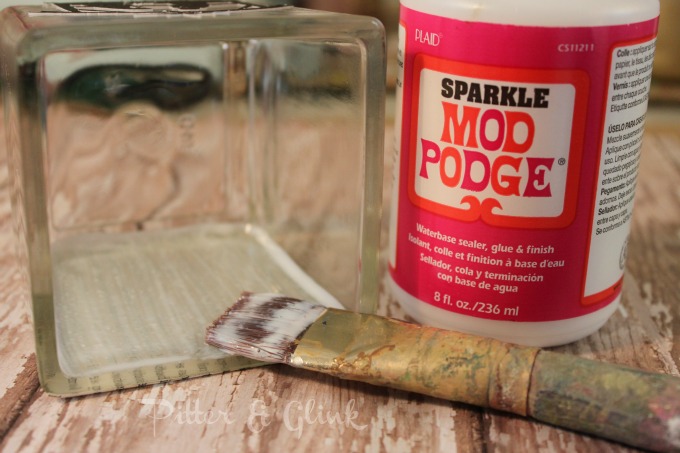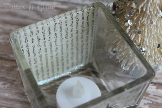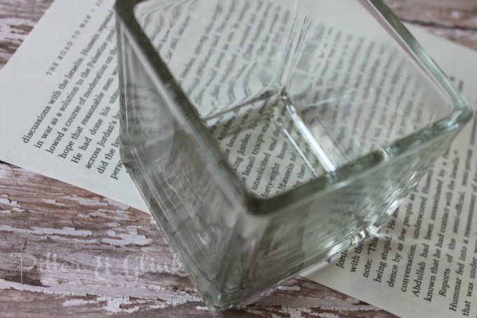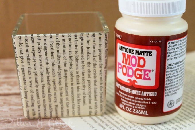 Step Two: Adhere the book page to the glass with Mod Podge. Cover the glass with a layer of Mod Podge and stick the paper to the Mod Podge, making sure to smooth out any bubbles. When the paper dries, cover the paper with another layer of Mod Podge to seal it. (I used antique Mod Podge, but regular Mod Podge would work just as well.)