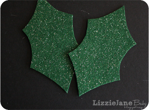 Step 4: I cut out 2 holly leaves from the green felt. I used the glitter felt because I thought it would add some fun to the wreath, and because it was a little stiffer and would hold it’s shape if it went over the edge of the wreath.