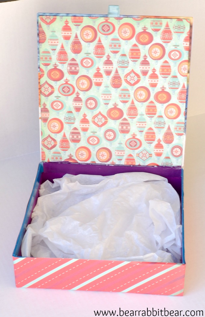 Step Two: Apply scrapbook paper to top of box, printed side up.