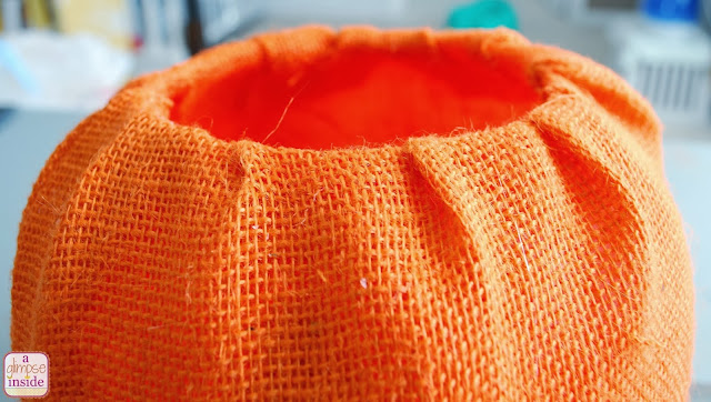 You will overlap the pieces as you go and it will create pleats along the top of the pumpkin. Play around with the size of pleats you want by moving the burlap around while gluing.