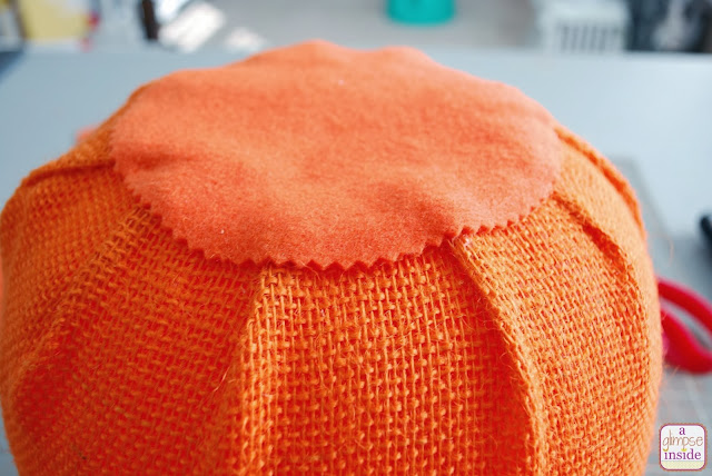 Cut out a circle in the felt to fit on the bottom of the pumpkin covering up the messing burlap ends. Glue down.