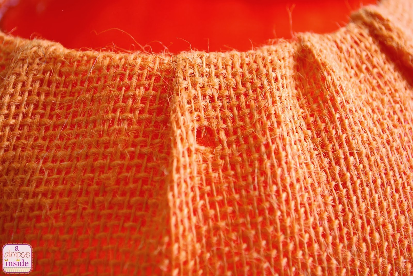 Before I continued, I found the original handle holes in the pumpkin and took a small pair of scissors and pushed them through the burlap where the hole was to create a hole so I can reinsert the handle.