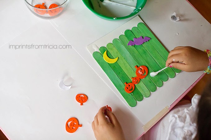 They then placed the moon and bat foam stickers at the top and glued on the button pumpkins into “the patch” anyway they wanted. My girls are 3 and 5 and they loved working with different textured art materials like the plastic buttons, the soft foam stickers, and the wooden popsicle sticks!